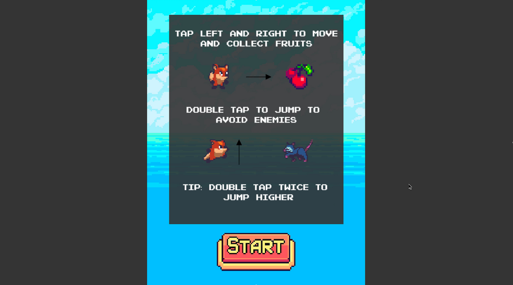 You are the fox of the jungle, your task is to collect all falling fruits and also avoid other animals running in the wild. Tap left and right to move, double tap to jump. While on air you can double tap again to jump higher!